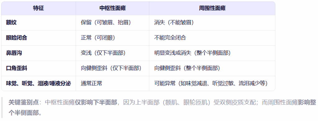 1.运动纤维:面神经核 → 表情肌(注意:上半脸双侧支配,下半脸对侧支配)