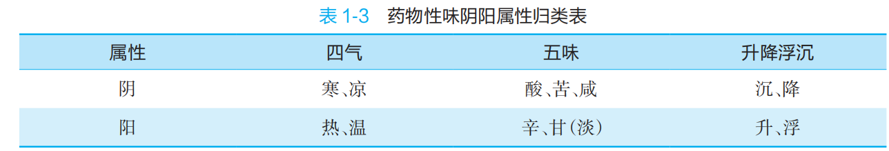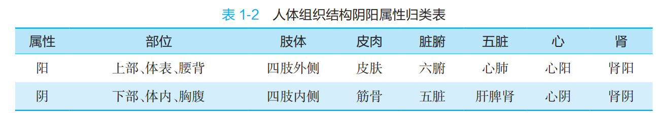 P12 阴阳的概念,P13阴阳的基本特征;表1-1事物与现象阴阳属性归类表。P18 表1-3 药物性味阴阳属性归类表